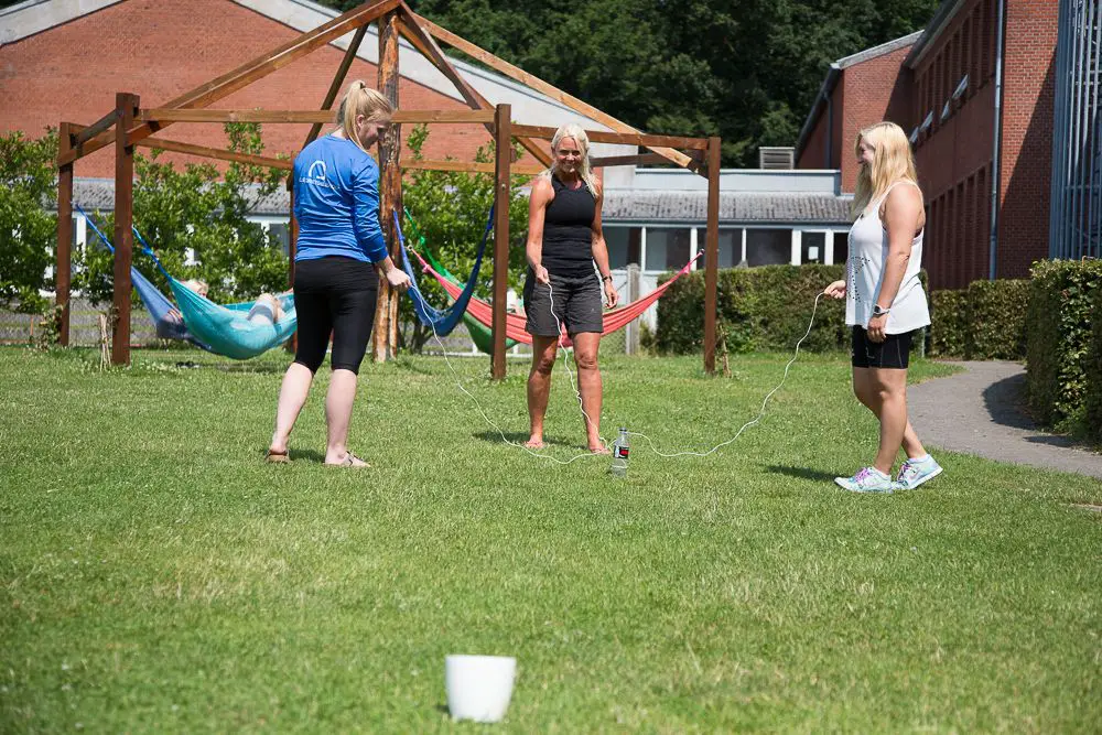 En anden snor bindes fast nederst på flasken. Flasken står på jorden og hver person skal nu holde i hver sin ende af de tre snore. Holdet skal nu samlet fylde vandet i en beholder, der står på jorden ved siden af.